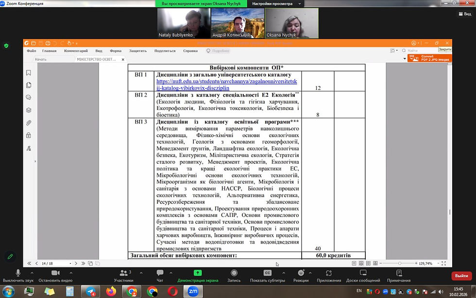 У ході засідання здійснено всебічний аналіз відповідності цілей та програмних результатів навчання ОПП актуальним вимогам у галузі екології та екоменеджменту, а також потребам і очікуванням здобувачів вищої освіти та інших заінтересованих сторін. Окрему увагу зосереджено на структурі освітньої програми та послідовності формування її освітніх компонентів.